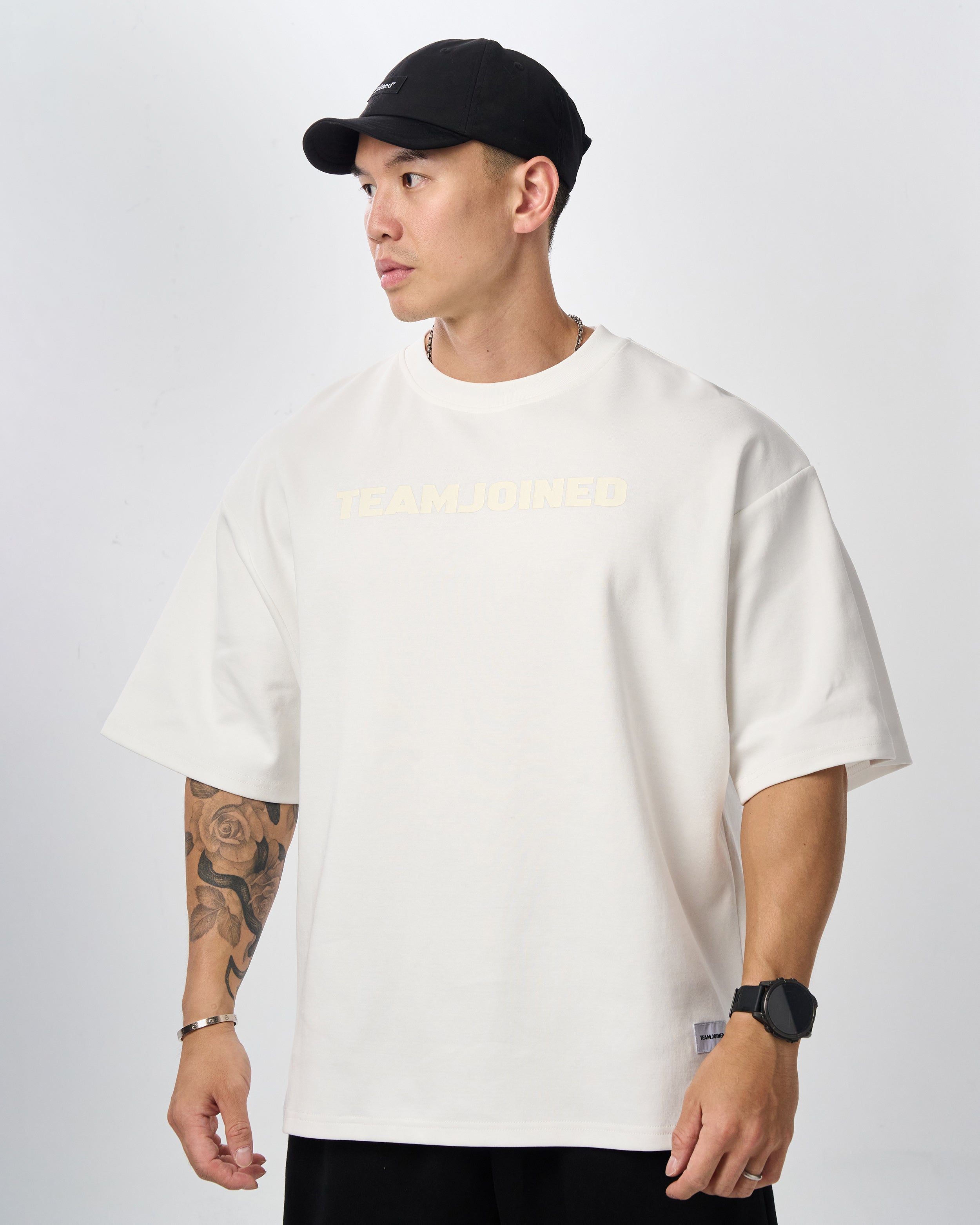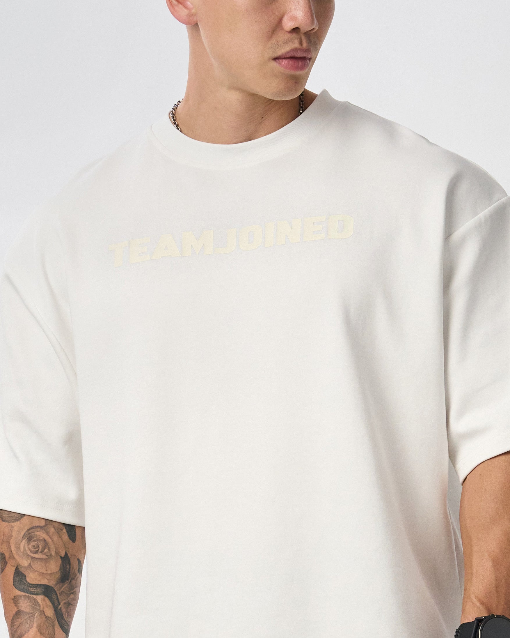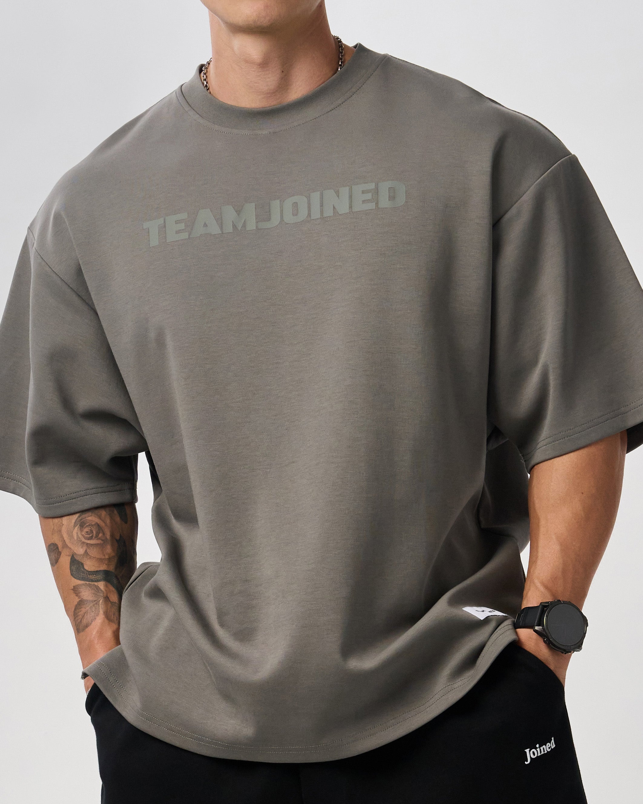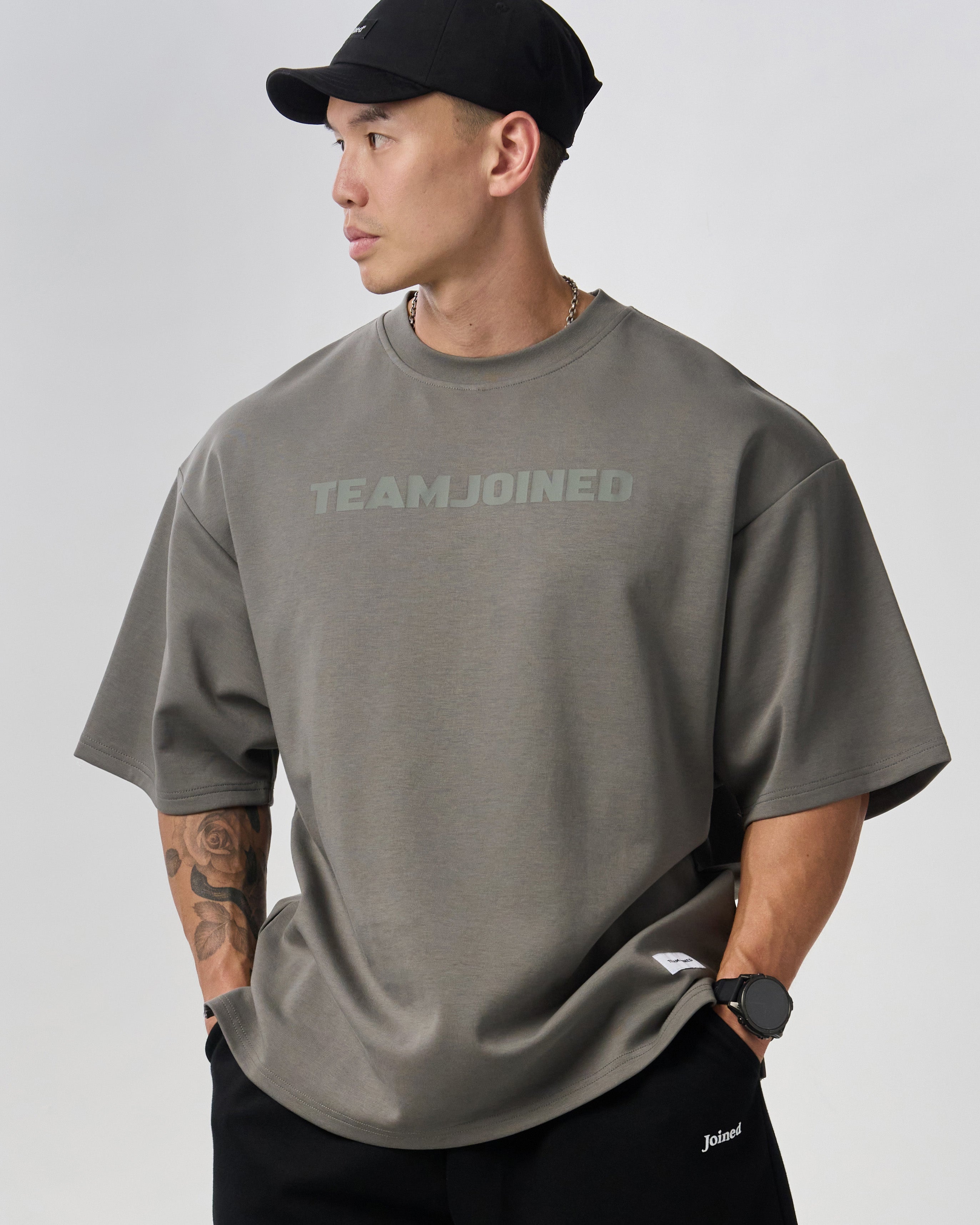 The chest features a large TEAMJOINED Logo in a tone-on-tone design, blending seamlessly for a clean visual. Low-saturation colors make it timeless and versatile. Oversized silhouette with side slits enhances comfort and mobility. Finished with a gray hem label for a sharp detail. Soft, breathable, and structured, resistant to wrinkles and deformation.