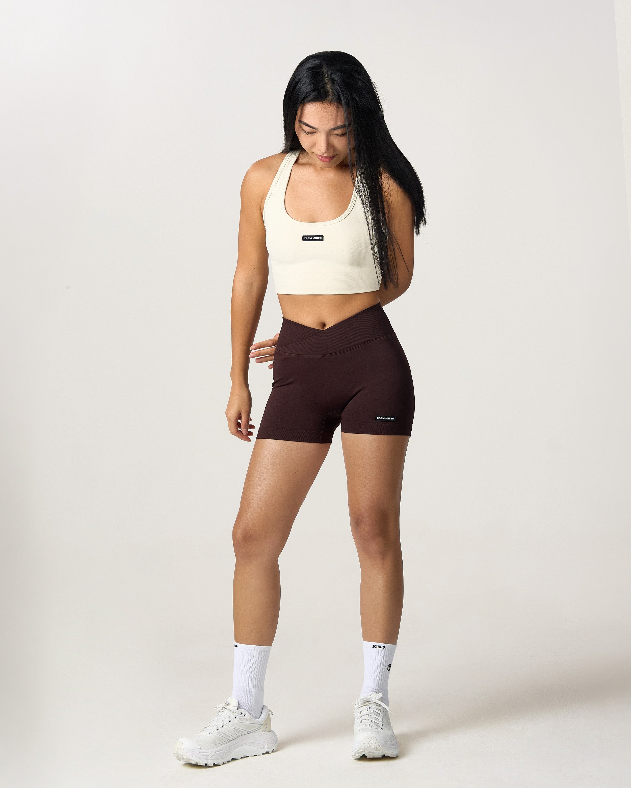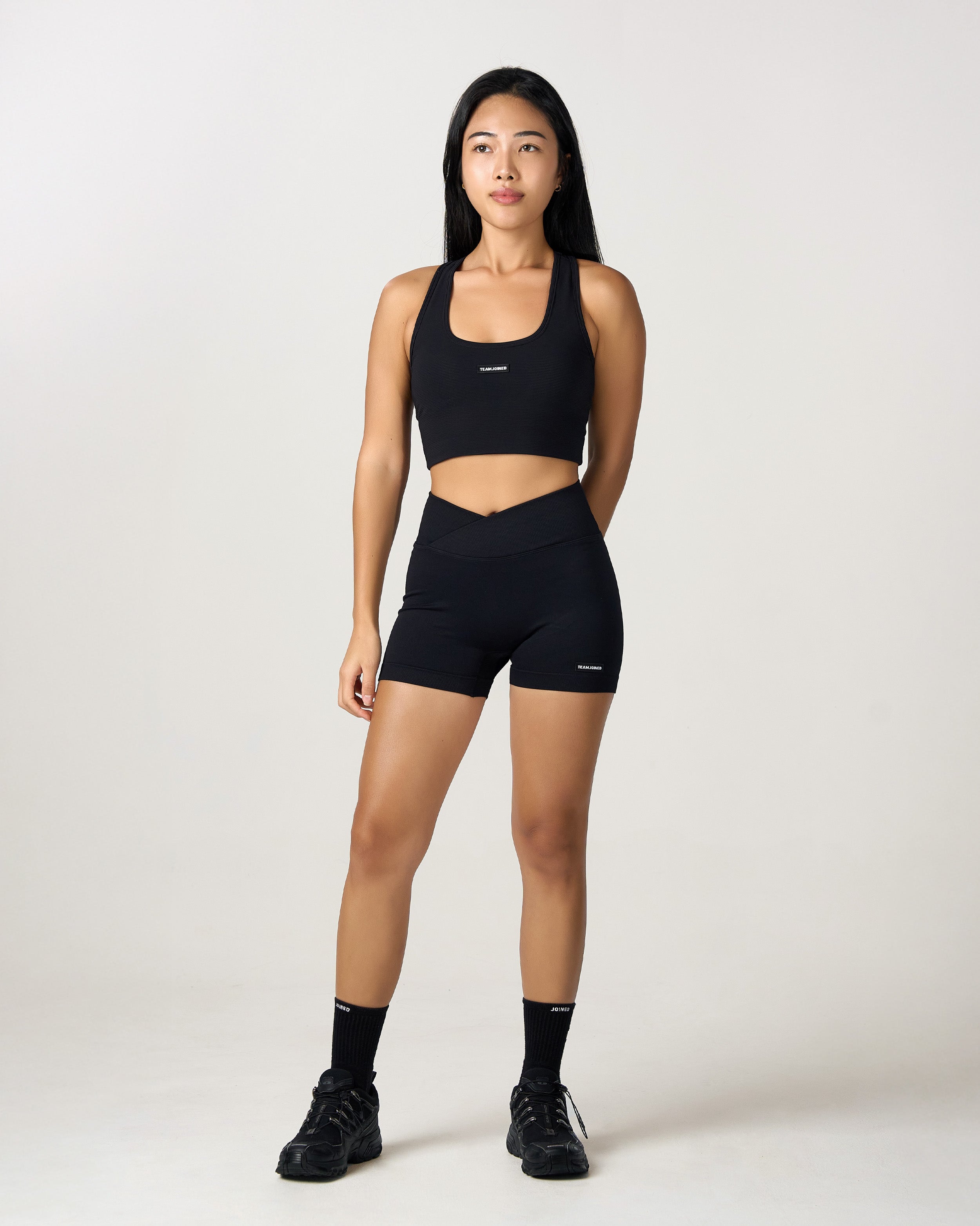 .Sculpting V-waist design paired with a flexible ribbed waistband for structured yet stretchable comfort